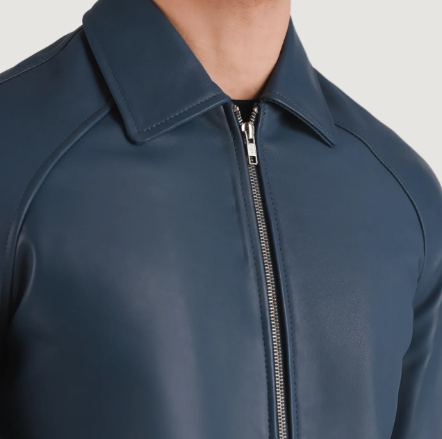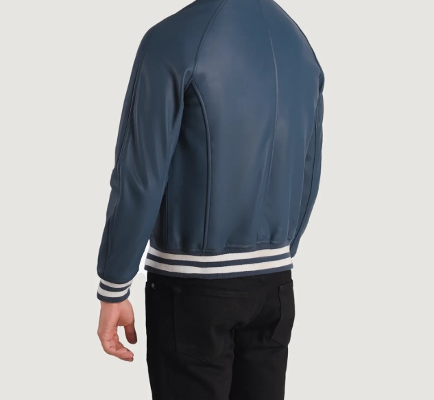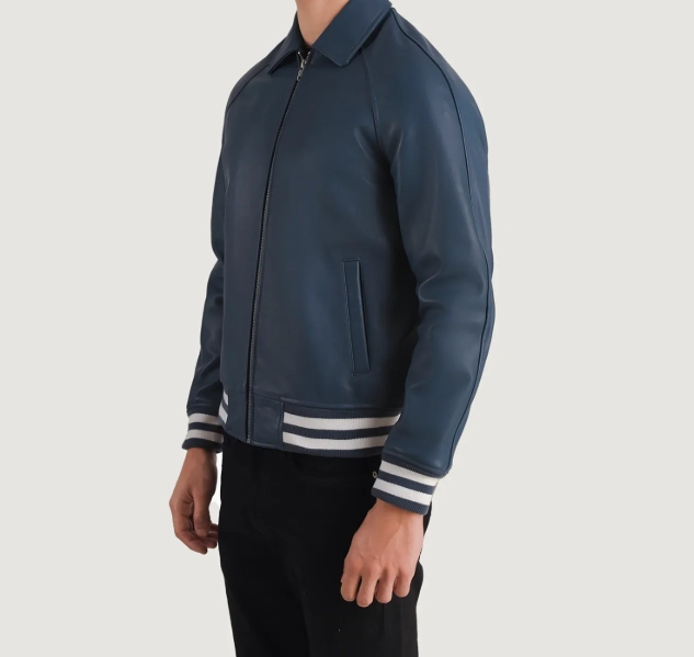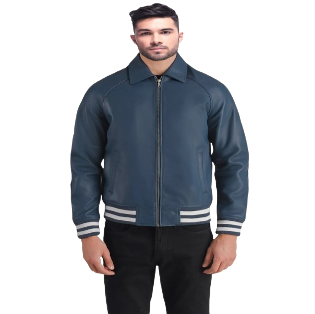 Real leather sheep skin Varsity jacket with closure style zipper, rib knit cuffs, two outside and two inside pockets, colour blue size x small.