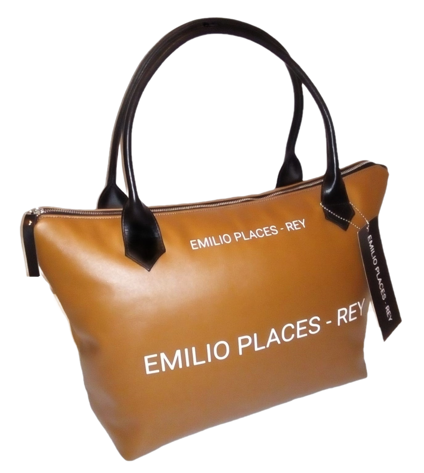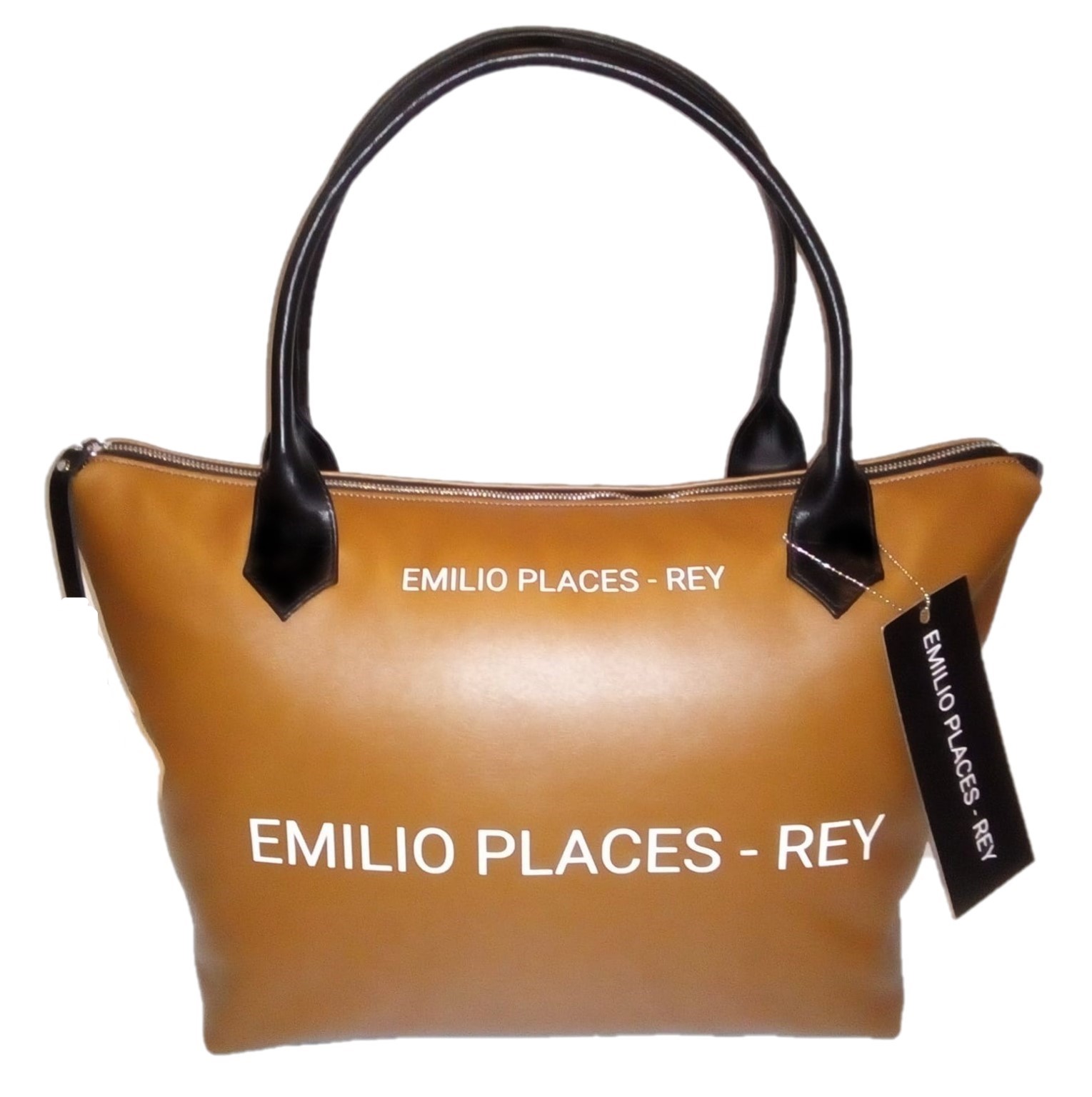 Ladies high quality 100% genuine Nappa leather tote handmade handbag, colour brown with white wording EMILIO PLACES - REY on both sides of handbag. Zip top, twin leather handles, 2 inside pockets and1 zipped with velvet material.